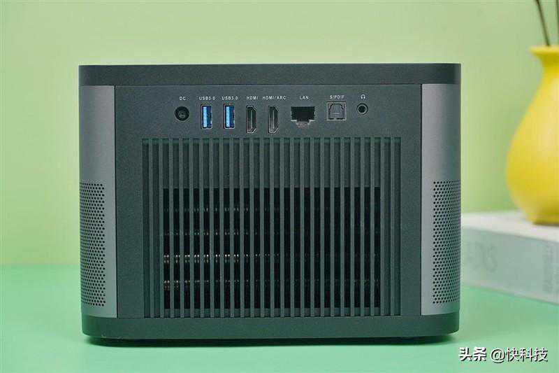 接口集中在机身背部,从左到右分别是DC接口、两个接口、HDMI接口、HDMI/ARC接口、网线接口、S/PDIF接口以及耳机接口。