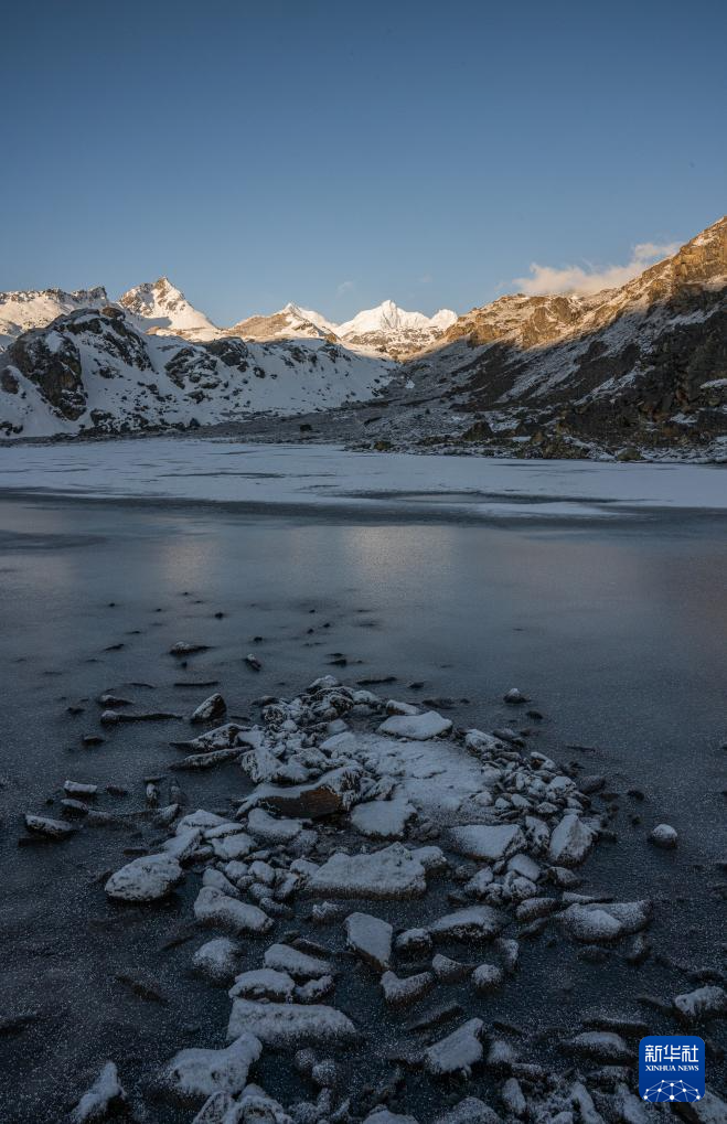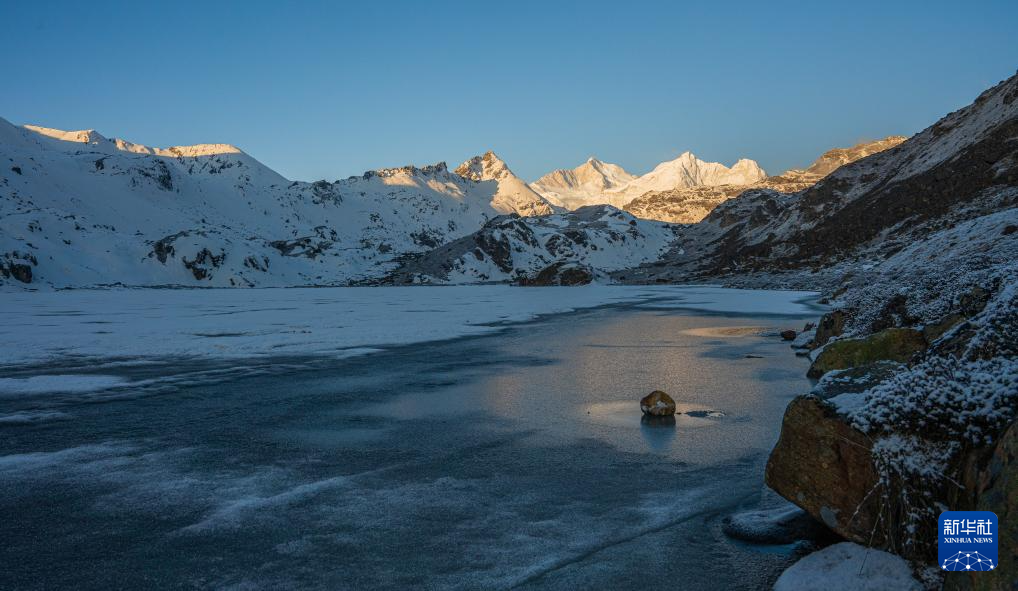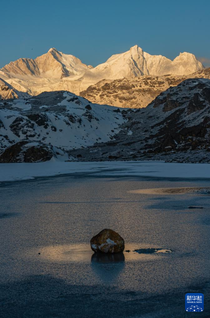 4月17日,晨光照耀嘎玛沟及远处的喜马拉雅山脉,清晨的第一缕阳光与雪山相映成趣,形成“日照金山”景象。