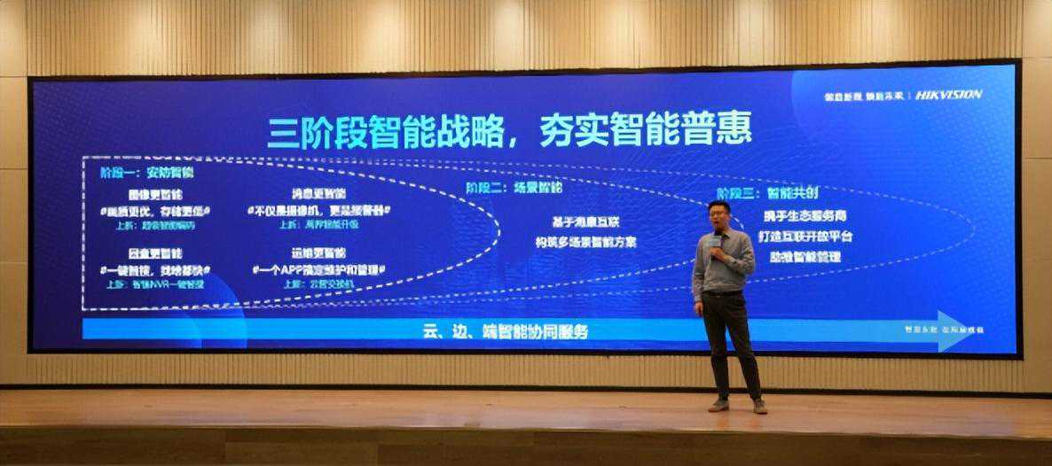 本次发布会,海康威视面向中小企业高频场景,提出“安防智能——场景智能——智能共创”三阶段战略,为广大客用户提供“云边端”协同的智能普惠产品、方案及服务。