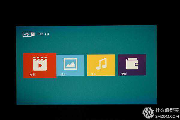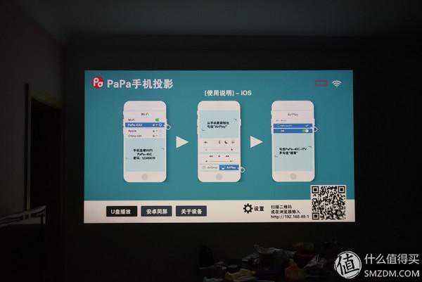 开机后的主界面,可以看到PaPa手机投影并不像常见的微投那样内置开放式的操作系统,而是像定位于手机投影,支持安卓设备,苹果设备及PC的同屏投射,此外还提供本机外接U盘播放