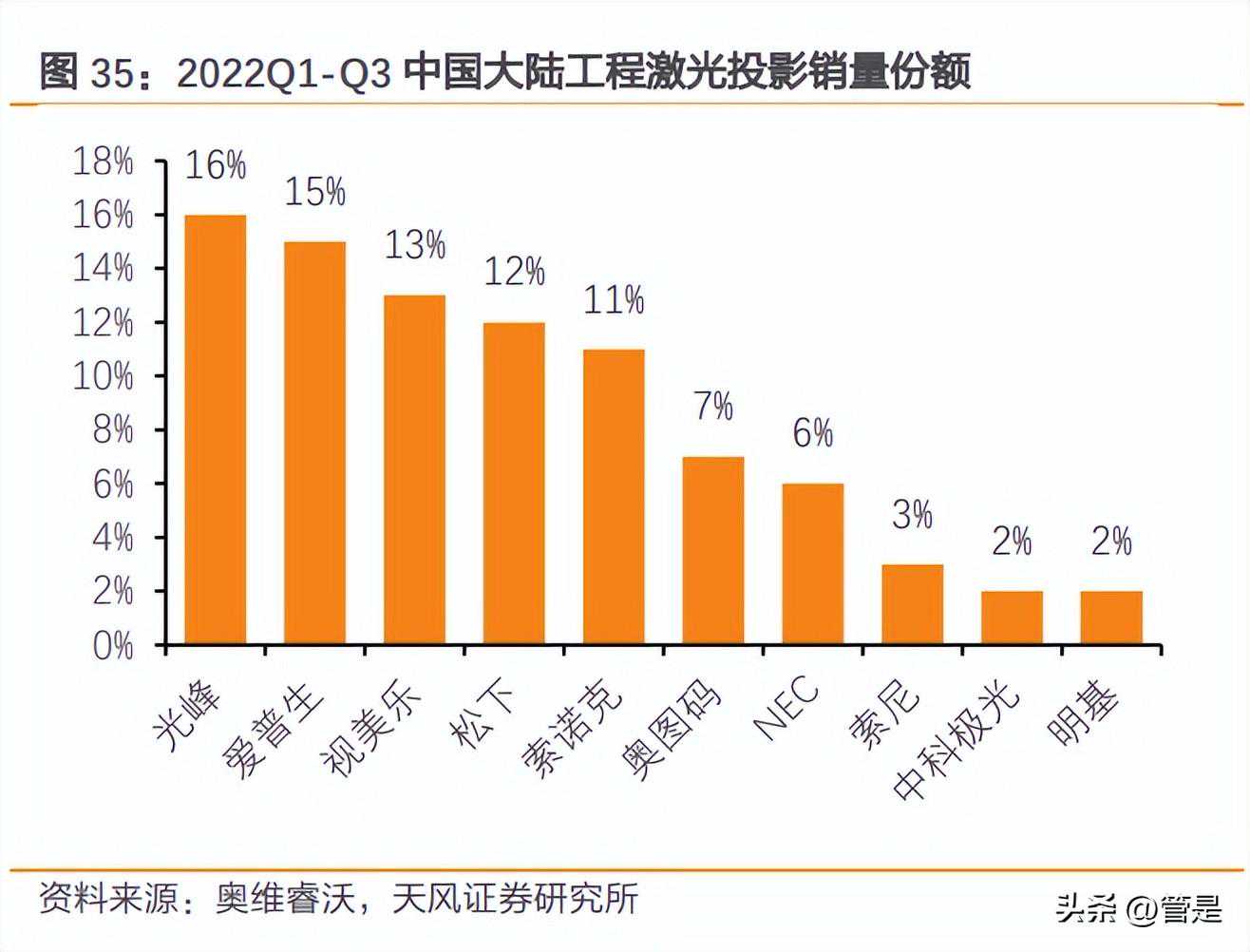 专业投影领域国产品牌逐步崛起。专业投影领域过往日系厂商如松下、爱普生、NEC、索尼等过往占据大部分市场份额,而近年来国内厂商如光峰、视美乐、索诺克等在份额方面逐渐领先。光峰在教育及工程领域份额领先,龙头地位稳固。在工程领域,根据奥维睿沃的数据显示,2022年Q1-Q3中国大陆工程激光投影市场光峰以16%的销量份额位列市场第一;而在教育领域,根据洛图科技的数据显示,2022年Q3中国大陆教育激光投影市场光峰销量份额排名第二,诺索克与光峰合计销量份额达到65%。
