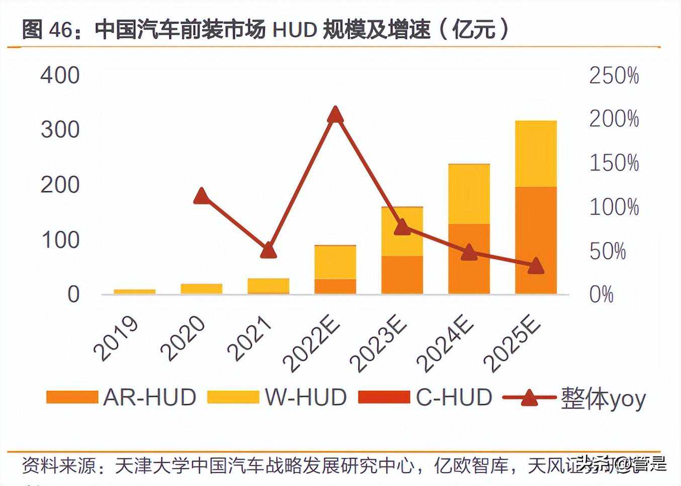 近年来AR-HUD渗透有望持续提升,行业增速上行。根据亿欧智库的数据显示,2021年我国汽车前装HUD市场渗透率达到5.7%(其中AR-HUD/W-HUD/C-HUD渗透率分别为0.3%/5.1%/0.4%)。截至2021年,W-HUD仍为市场主流解决方案,AR-HUD或处在高增的前夜,根据亿欧智库预测,2025年我国汽车前装HUD渗透率可达到45%(其中AR-HUD/W-HUD分别为18%/27%),我们认为后续随着汽车智能化加速,技术成熟带来的AR-HUD相关成本持续下行等因素影响下,AR-HUD渗透率有望持续提升。从市场规模的角度来看,根据亿欧智库的数据,2021年我国汽车前装HUD市场规模达到29.6亿元,同比+51%增速,2025年预计市场规模可达317.4亿元,21-25CAGR可达81%,整体规模后续有望实现高速增长。
