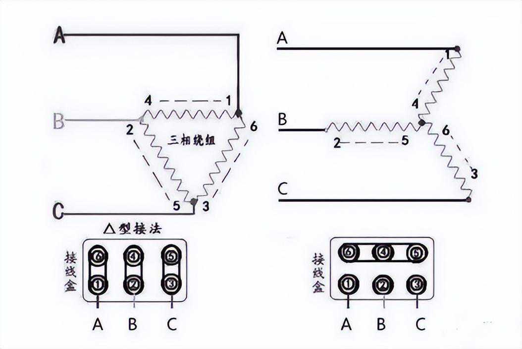 星型就是三个绕组的尾端连到一起,三角形是三个绕组首尾连接。