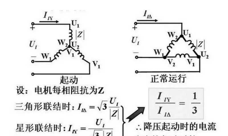 当我们改成星形连接后(负载与输入电压不变),每相负载两端承受的电压是原电压的根号3分之一(即220V),那么流过每相负载的电流仅是原(角形连接)电流的1/3,这就是降压启动的原理。
