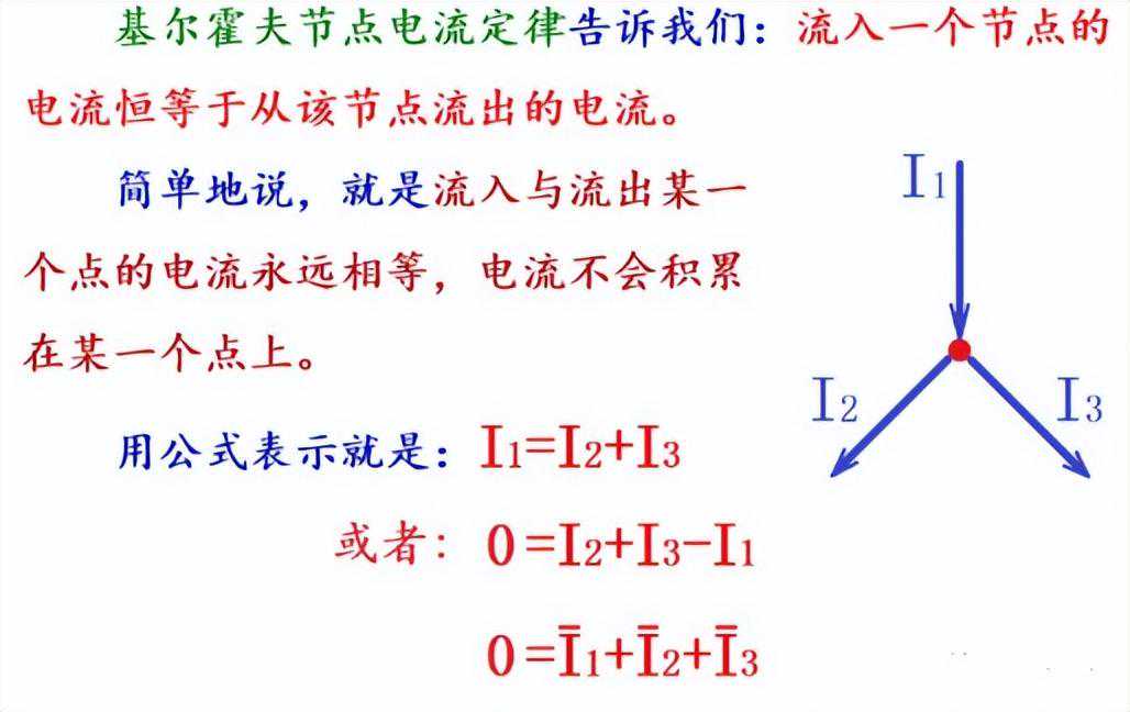 接下来再复习一下基尔霍夫节点电流定律,请看下图。从图中我们知道,流过任何一个节点的电流,总是恒等于从该节点流出的电流[也可以说各分支路电流的代数和(交流电为矢量和)等于0],也就是说,电流不会在节点中积累。