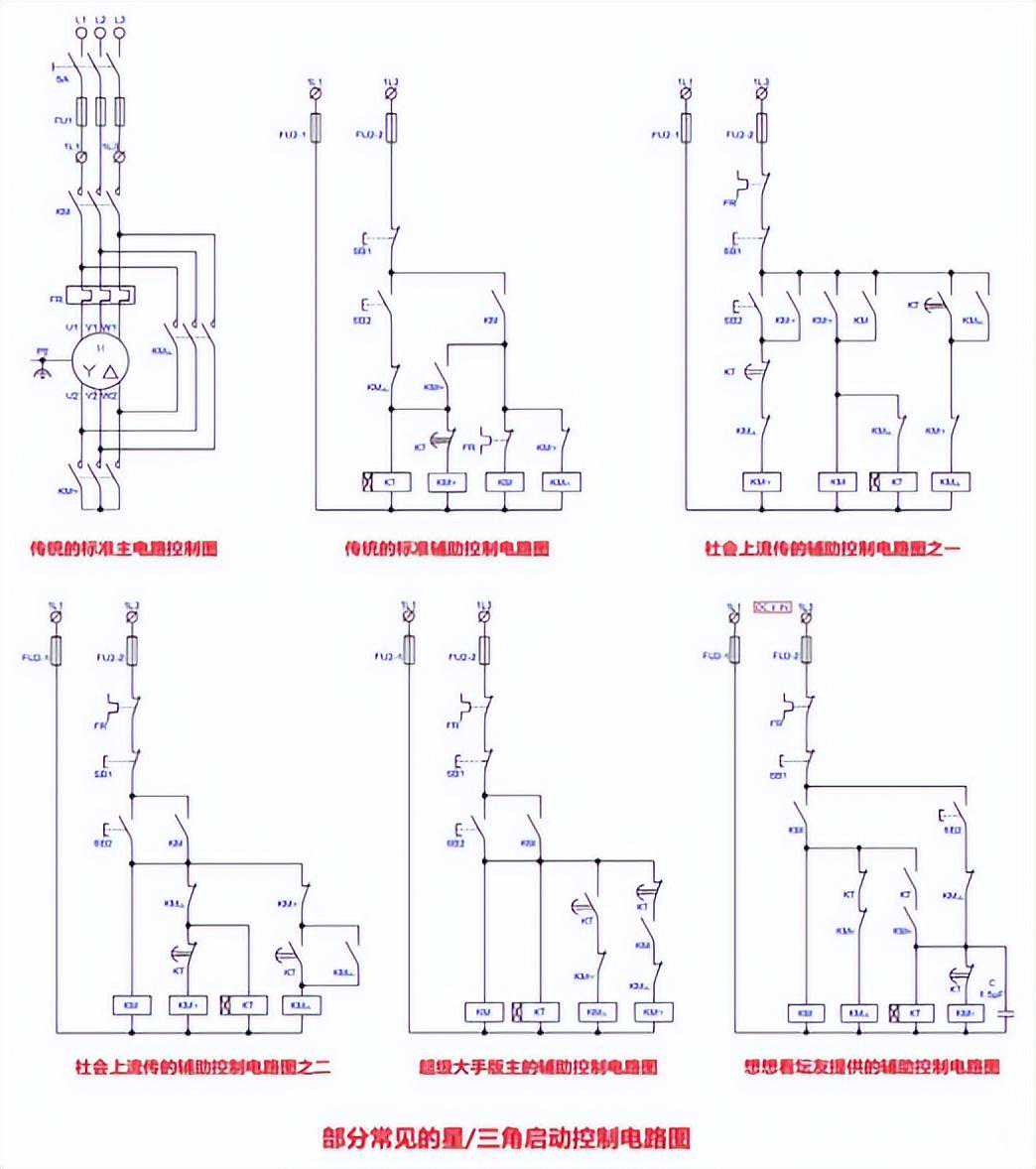 接下来就要开始对星/三角降压启动电路进行分析,请看下面的图。图中左边第一个主控制电路是标准的星/三角降压启动主控制电路,是一个通用电路。而左侧和下侧的辅助控制电路中,第一个是传统的标准的通用辅助控制电路;第二、第三个是现在社会上流传的辅助控制电路之一;第四个是我对电路进行标准化整理后的辅助控制电路;第五个是经过我标准化整理后的辅助控制电路。