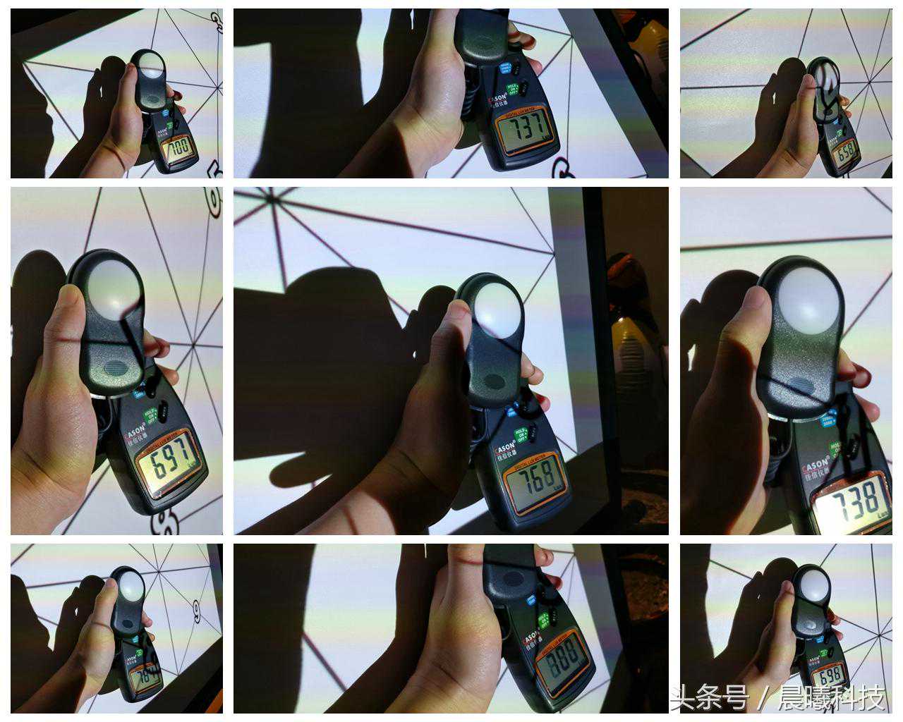 大体的测试过程就是在距离幕布一米外,用照度计对标准棋盘图上各个点的亮度进行测量,然后根据各点照度来求得9个点的平均照度,然后用平均照度乘以投影画面面积得出的就是ANSI流明。