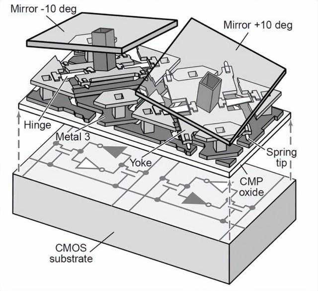 不过,这些小镜片并非静止的状态,它们采用特殊的铰链机构“悬浮”固定,可以偏转一定角度,而输入到投影机中的图像信号会先转换成数字信号并传送给DMD芯片,DMD芯片底层的CMOS会根据图像亮度的大小,控制每个小镜片的偏转的占空比,这些小镜片会进行高速偏转震动,这样DMD芯片就能连贯显示整幅的图像,投影机的光源反射到DMD芯片后就会呈现出图像,再通过镜头投射到幕布上。