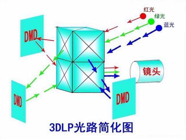 当然,DLP投影机之间也存在着“内卷”。市场上除了单DLP芯片,还有3DLP芯片的产品,即配备了3块DMD芯片,光源也由单色改为红绿蓝独立三色,每块DMD芯片只反射一种颜色的光线,去掉了色轮组件。三块DMD芯片的投影机结构相对更加复杂,工作时发热量也更大,需要更好的散热系统,外形尺寸也更大,制造成本也更高,通常应用于一些特殊专业的领域,且只能采用固定的安装方式。