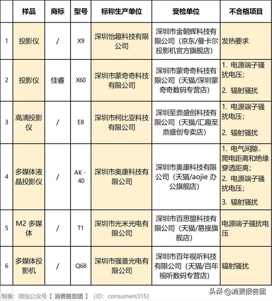 天猫的深圳蒙奇奇数码专营店、汇趣至鼎盛创专卖店、aojie办公旗舰店、易接旗舰店、百年视听数码专营店等5家企业检出了不合格投影仪,分别涉及“电气间隙、爬电距离和绝缘穿透距离、电源端子骚扰电压、辐射骚扰”等项目不合格。