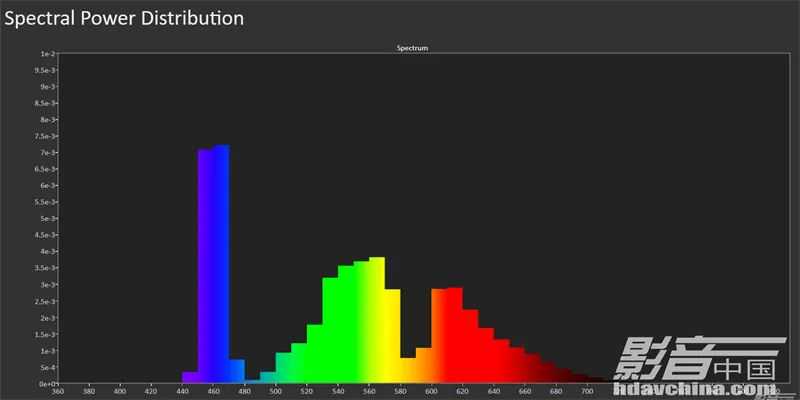 从光谱能量分析图中,我们可以发现蓝光拥有最高的光谱能量,主要集中在460-470nm区间,绿光能量则是在540-570nm区间,红光能量在600-620nm区间