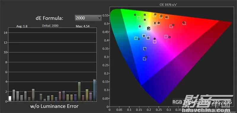 在HDR与色域ColorChecker色准测试中,XW7000在原生预设画面模式下,平均dE2000误差值为1.8,同样也低于人眼可识别的误差值范围