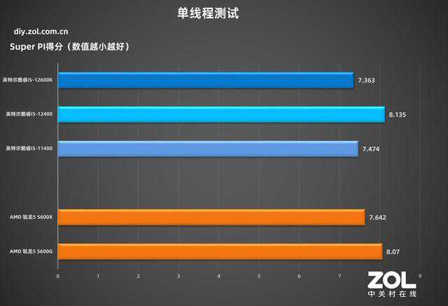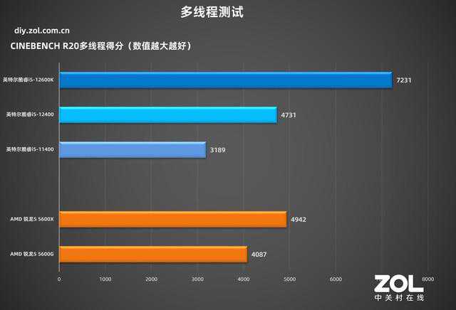 单线程测试中,除了SuperPI酷睿i5-12400没有酷睿i5-11400成绩高外,/R15/R20三个版本依旧大幅领先酷睿i5-11400,12代酷睿看来没有对SuperPI进行优化,这一代整体表现在这款软件中很一般,酷睿i5-12600K甚至都不如酷睿i5-11400。不过CINEBENCH,12代酷睿就是强项了,酷睿i5-12400甚至在R20和版本超越了锐龙55600X。
