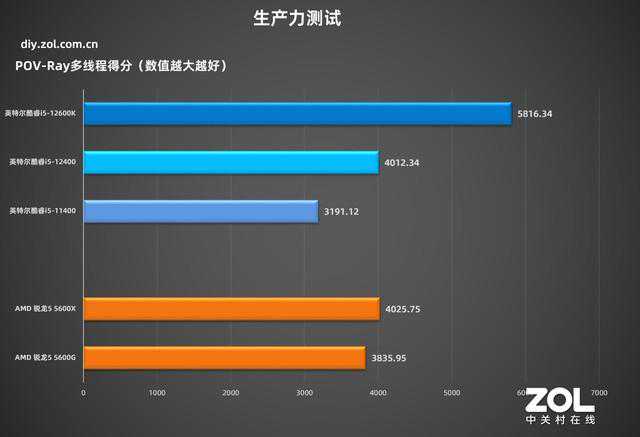 生产力测试比较有趣,酷睿i5-12400在Bler和POV-Ray上表现都要优于锐龙55600G,而X264和X265被锐龙55600G反超。这项测试除了考验处理器本身性能外,也需要英特尔和AMD的生态优化,在这方面,目前两者都有自己的优势领域。