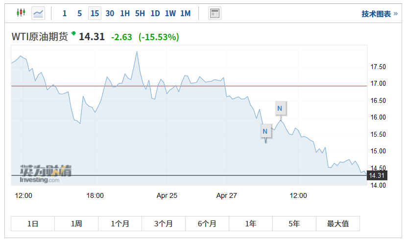 4月27日,国际原油继续暴跌。截至发稿,WTI原油跌超15%,伦敦布伦特原油跌4.07%,国内期货市场,原油主力期货大跌超5%以上。
