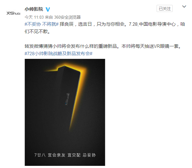 距离小帅影院新品发布会仅剩下一周的时间了,不过有关于新产品到底是啥依旧是个谜。日前,小帅影院官方微博首次公布有关于发布会内容,或许可以依此窥见新品端倪。根据公开的海报内容,小帅影院将于7月28日召开战......
