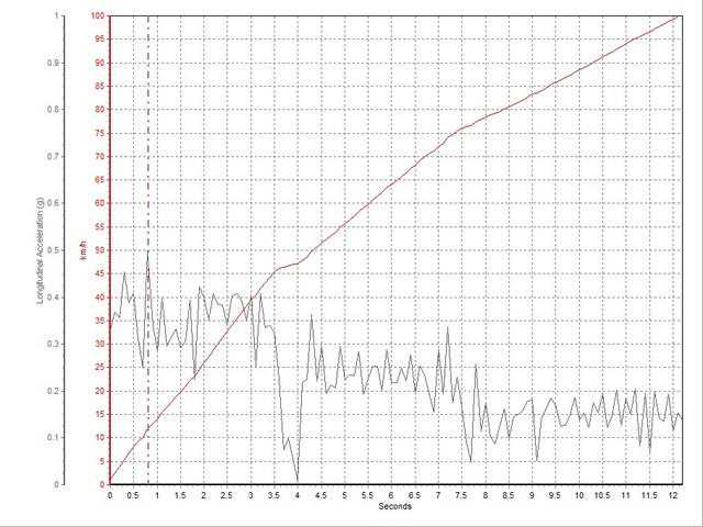起步阶段缺乏爆发力,最大G值仅为0.49g。另外,轮胎抓地力的不足也让车辆在起步瞬间陷入了较为明显的空转打滑。