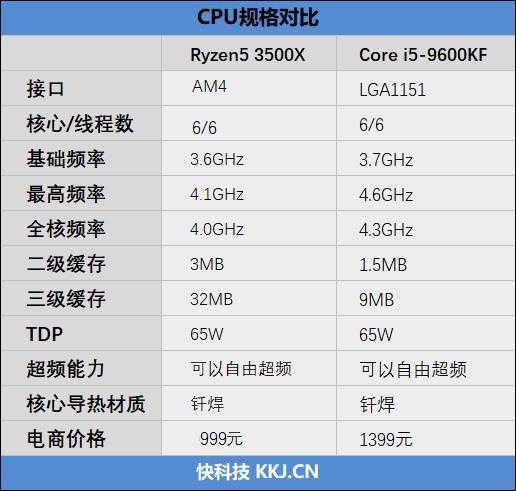 现在在千元价位,售价1399元的i5-9600KF比较受玩家欢迎,而AMD这边与之对位的是锐龙53600。不过实际就游戏性能而言,锐龙53500X与3600并没有多少差别,在参数上它也与i5-9600KF更为接近,二者同样都是6核心6线程。