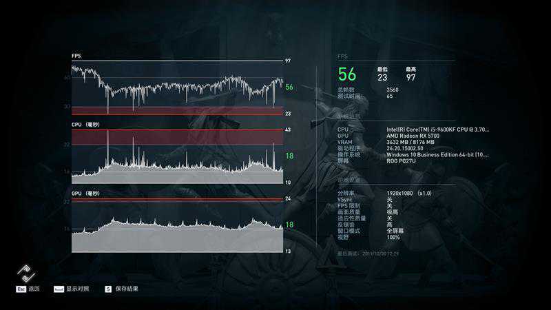 i5-9600KF的帧率是105FPS,从上图可以看到,RX5700基本上是全程处于瓶颈状态。