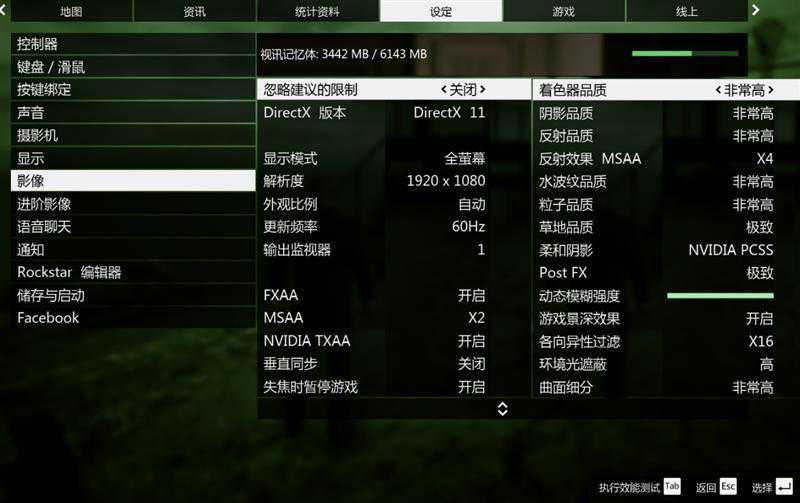 以下是我们在GTAV中的参数设置,1080P分辨率下,显存占用为3442MB。