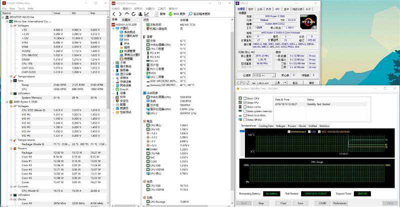 在温度方面,锐龙53500X的表现要逊色一些,烤机温度计达到了71度,比i5-9600KF高了14度。不过老实说,71度也并不是太高。