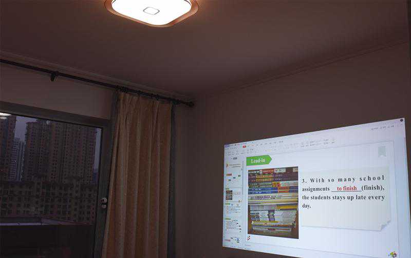 首先,我是在开着屋内顶棚大灯进行投射的,明基MH560投影仪的分辨率为1080P(1920*1080,16:9),1080P成熟的技术,3800流明是真的够亮,完全碾压室内光线,1DLP单片0.65DC3DMD芯片承载了更大的光通量,网课当然是要开着灯来看的,不然对眼部没有多大好处。