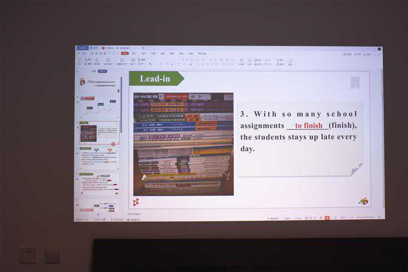 网课当然是每门课程都非常关键,大量的图形文字需要孩子用眼观看,除了3800流明的高亮度表现,1080P(1920*1080,16:9)的投射对比度,将字体投射的非常清晰,就连课件左边的最小字体都表现的相当锐利。