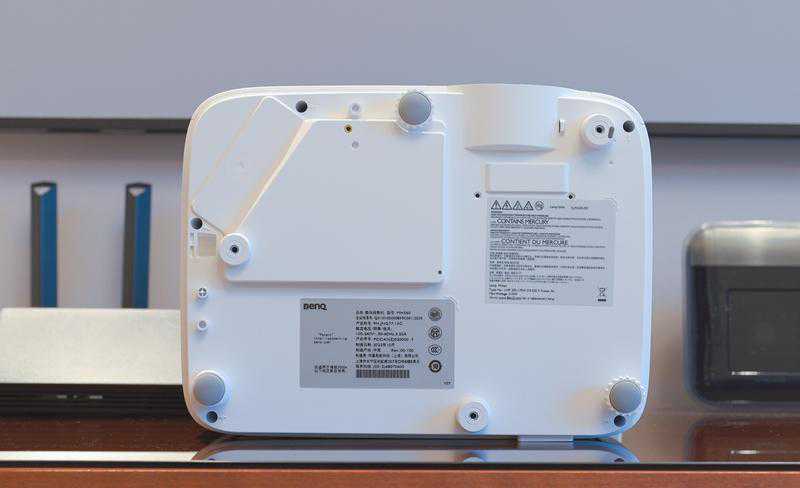 底部集成了很多安装点位,每个点位均有硅胶接触面覆盖,增稳的同时起到静音效果,这款明基MH560投影还是支持吊装设计哦,预留了三处螺丝孔位可以根据室内装修提前预留吊装支臂。