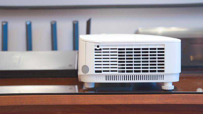 明基MH560高亮投影仪外观采用经典的平铺式设计,明基范儿拉满,纯白配色整体非常简洁亮丽,前置摄像头也是标志性的设计在右侧,左侧即使侧面的散热排风口及BENQ经典的LOGO。