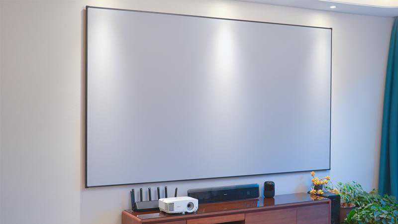 搭配我的120寸幕布,目前没有进行吊装装修,只能放在茶几上投射,由于没有横向拉宽校对,导致放大或者缩小屏幕就必须手动将投影前后移动,最终贴合墙面投射距离120寸幕布边缘还是差了一点点,还是放在茶几上吧。后期进行吊装安排。