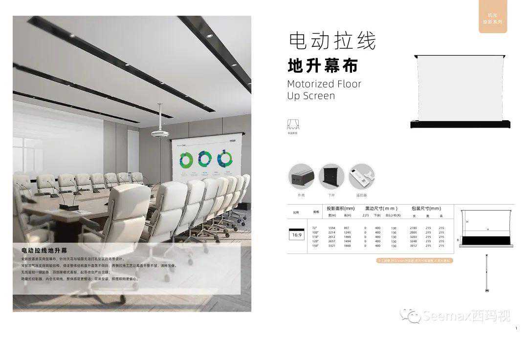 来了来了,它来了!Seemax西玛视:全新推出电动拉线地升幕解决家庭用户的安装烦恼即摆即用毫无负担两种幕料任君选择超清软白短焦黑栅抗光超清软白幕:表面钻石颗粒喷涂,最大程度还原本真色彩,满足高分辨率投......