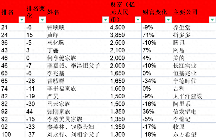 拼多多()黄峥领跑,其财富为3850亿元,全球排名第24名;腾讯(00700.HK)马化腾位居其后,其财富为2500亿元,全球排名第36名;其后为网易(09999.HK,)丁磊,其财富为2100亿元,全球排名第43名;阿里系的马云家族位居第三,其财富为1500亿元,全球排名第82名。
