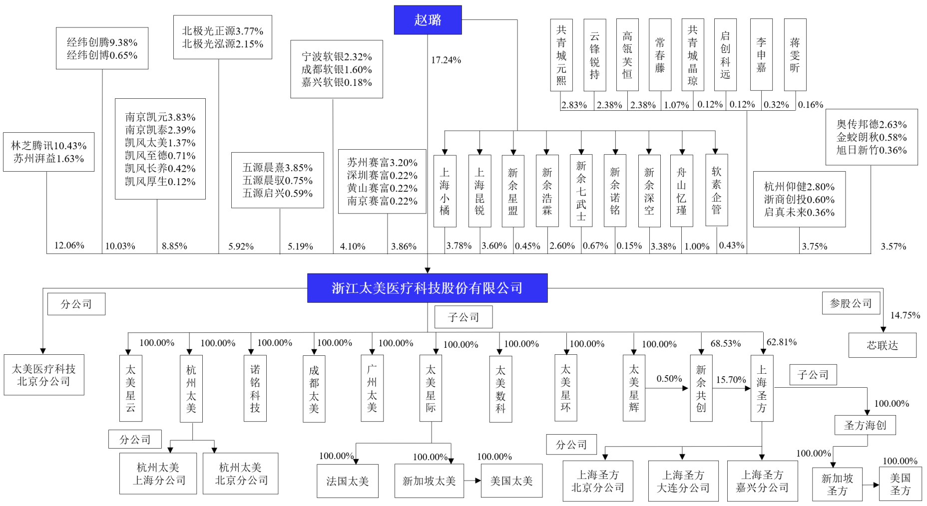 本次上市前,太美科技的控股股东、实际控制人为赵璐,其直接持有该公司17.2441%的股份。同时,赵璐通过上海小橘等9家持股平台间接控制太美科技16.0552%的股份,合计控制该公司33.2994%的股份。