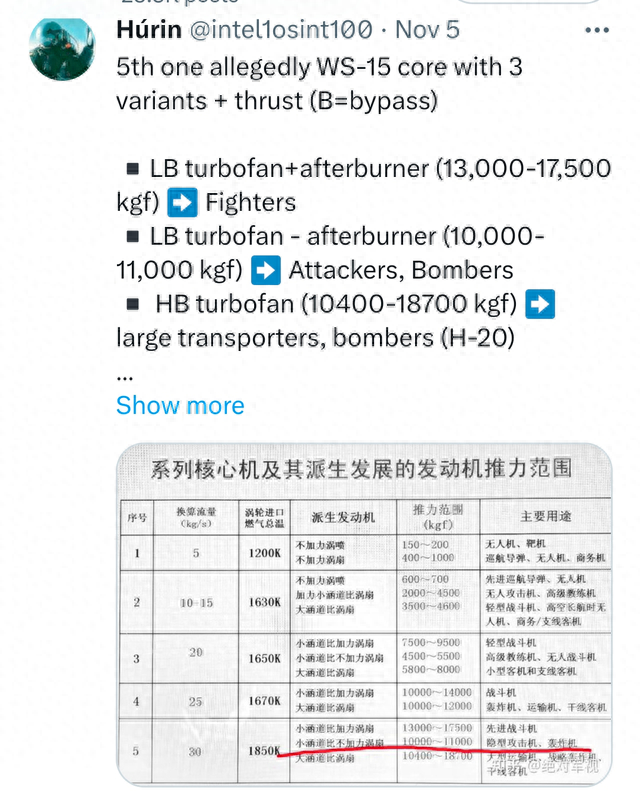表格还表示,无加力版WS-15还会被用在隐身攻击机上。考虑到之前一直有传言说中国除了会有轰-20之外,还会有歼轰-20。这款11吨推力的无加力涡扇的装机对象,算是侧面证实了歼轰-20的存在。只不过歼轰-20和轰-20的发动机没有加力燃烧室,也就意味着这两款飞机很可能不具备超音速能力,有些惋惜。