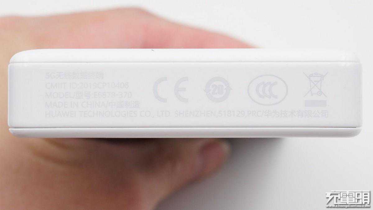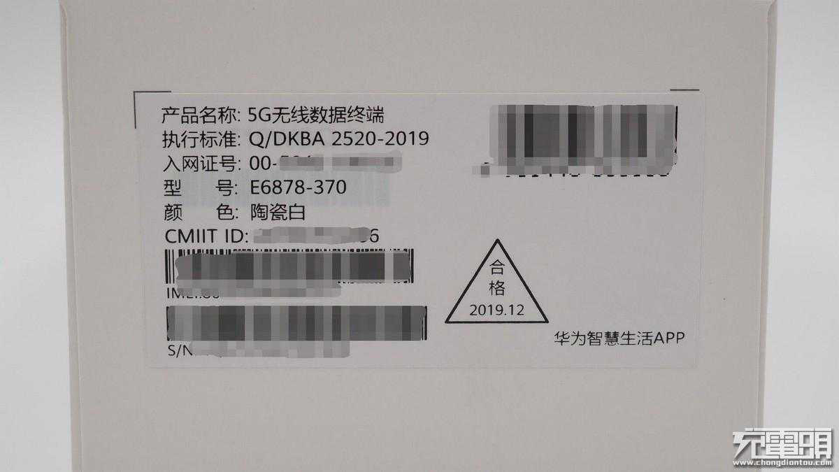 包装盒底部印有产品的基本信息:产品名称:5G无线数据终端;型号:E6878-370;颜色:陶瓷白。