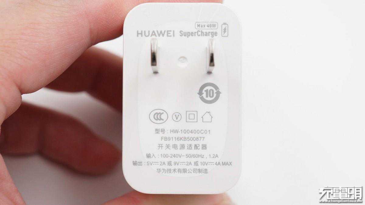 充电器输入端外壳上标注产品参数信息:型号HW-100400C01;输入100-240V50/60;输出5V/2A、9V/2A、10V/4AMax;华为技术有限公司制造。充电器已经通过了3C认证和VI级能效认证。
