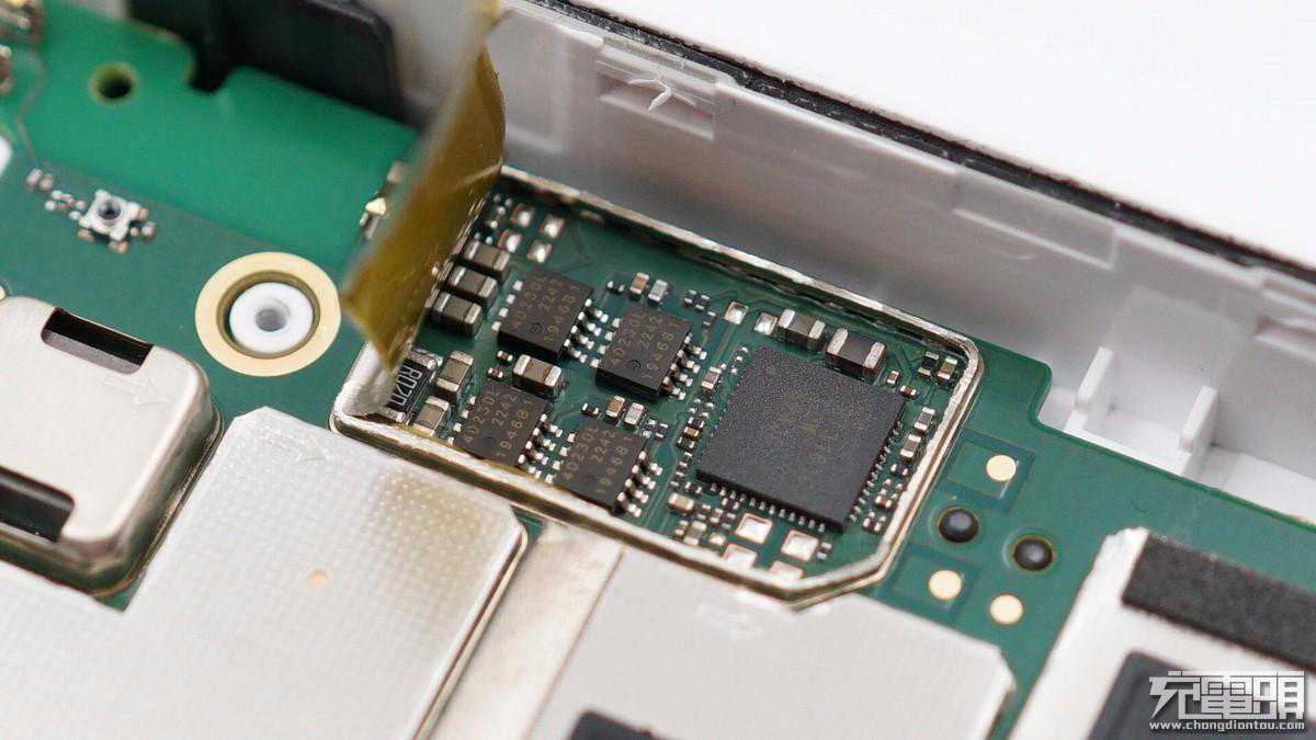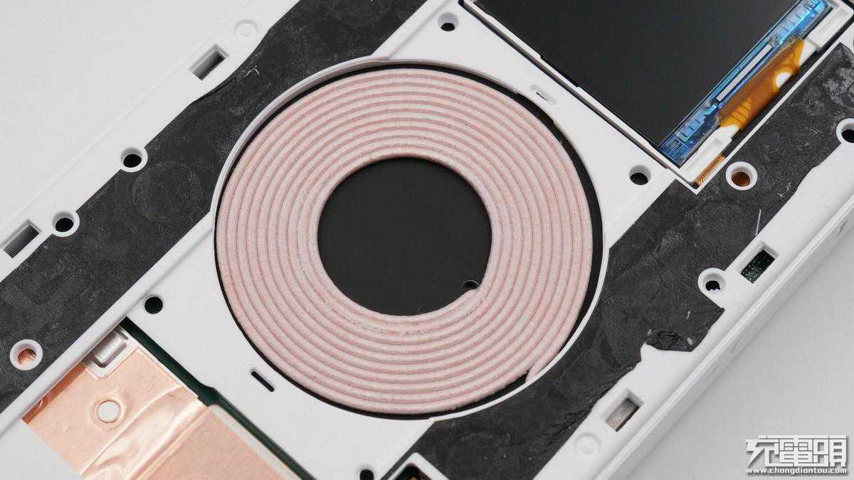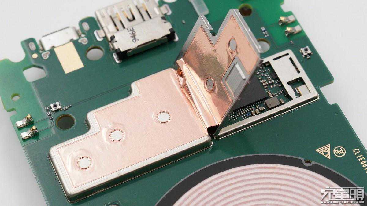 机子电路板上的芯片全部覆盖有金属屏蔽罩,避免干扰,主要发热芯片上还贴有导热垫帮助导热;电芯放置在凹槽里,凹槽区域采用铝合金材质,帮助电芯散热;无线充电线圈绕制紧密,线芯焊接牢固。这款产品整体做工优秀。