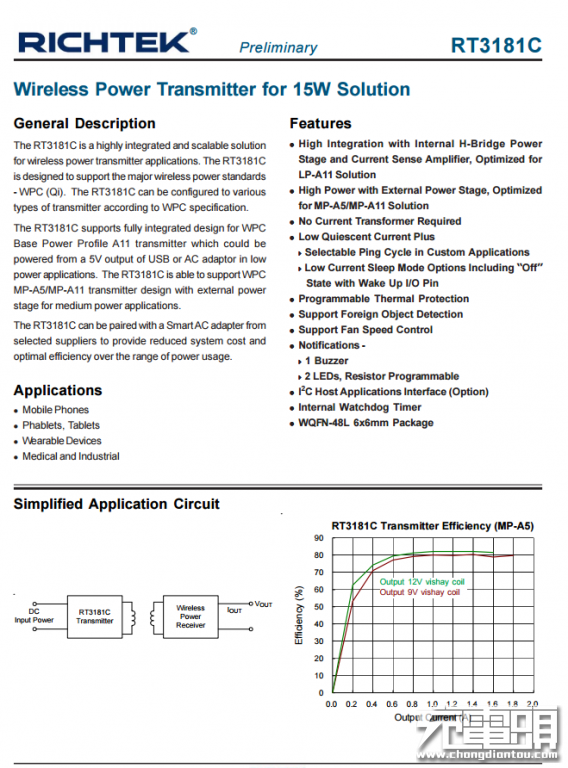 Richtek立锜RT3181C无线发射器解决方案,其内部集成H桥功率级和电流检测放大器,为LP-A11线圈方案优化,外置功率级可以支持高功率输出,支持MP-A5/MP-A11方案,支持可编程的温度保护和风扇转速控制,这款无线终端支持15W无线充电输出。