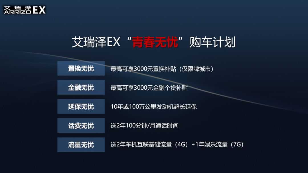 值得一提的是,针对购车用户,奇瑞还推出了艾瑞泽EX“青春无忧”购车计划,可享受5重大礼。如果近期你有购车打算,那么现在就是购买艾瑞泽EX的最佳时机!