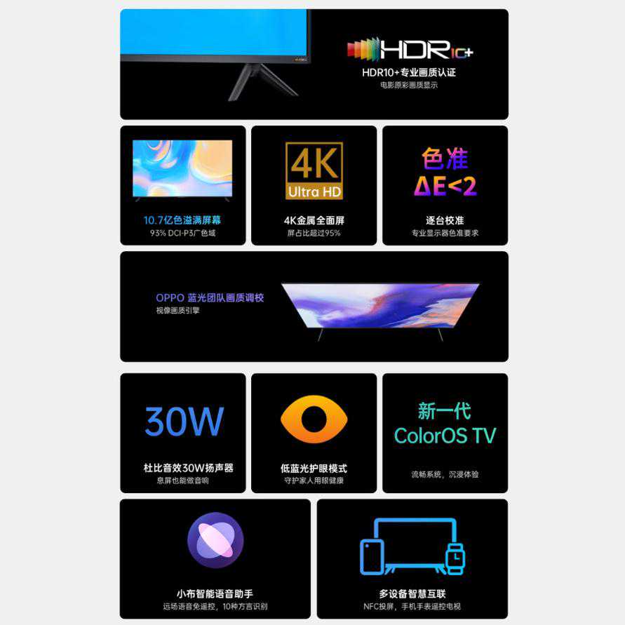 用一张图可以看到其所有特点,比如NFC一碰投屏,比如远场语言,比如逐台色准调控,都是很有特色的。此外,其还可以与OPPO新发布的TWS耳机连接,十分方便。