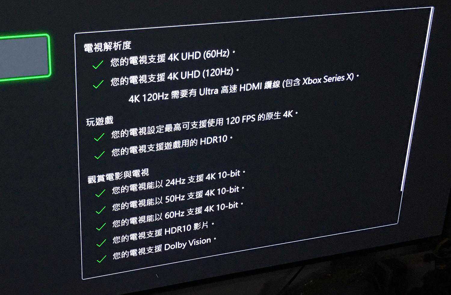 我们看看网友用XBOX进行的测试,120Hz不支持,杜比视界不支持,这两点还是造成了很多红叉的,不过其支持HDR10,也支持10位4K分辨率,也算可以了。