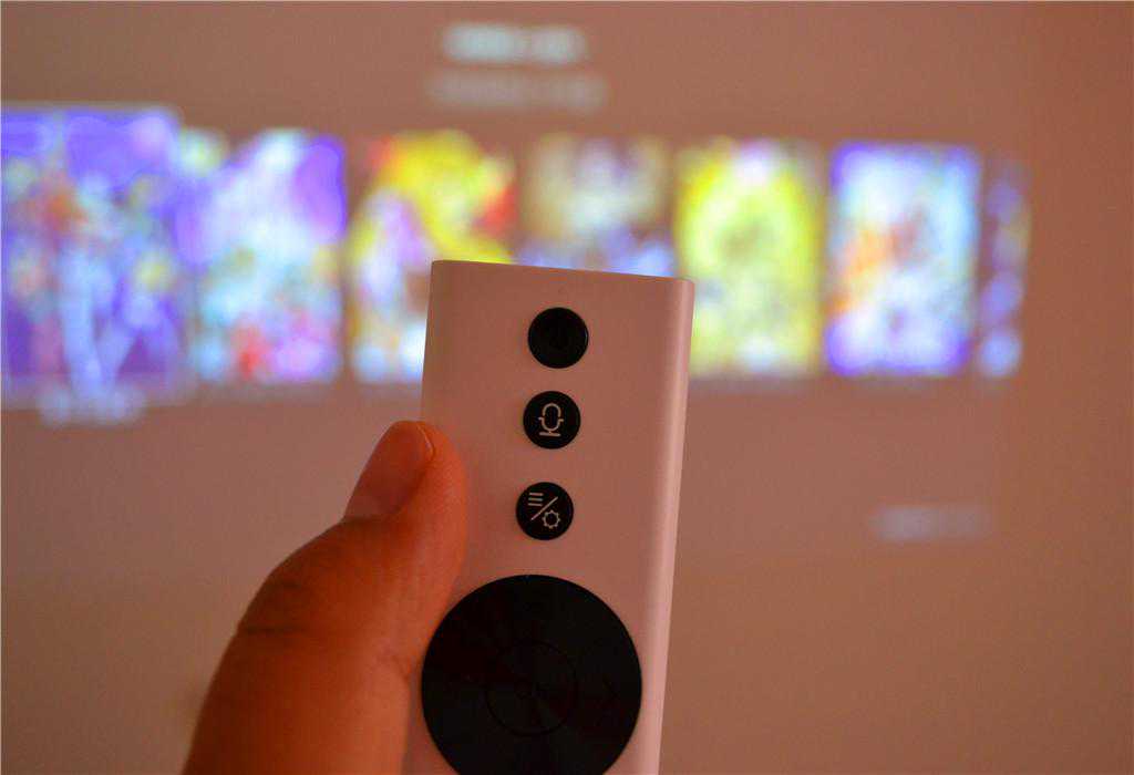 极米Z6的一个重要配件就是遥控器了,极米Z6配备了一款具备蓝牙语音操控的遥控器,按键设计采用了时下流行的12键设计,分别控制“开关、语音、功能、上下左右方向、OK、确定、返回、HOME键、音量加减”功能。在遥控器的底部带有电动对焦与音量键切换开关,实现音量键控制音量及电动调焦的功能切换,非常巧妙的设计。内置麦克风可以实现语音操作,遥控器且内置的中立感应模块能准备识别体感控制,使这款遥控器成为一款游戏手柄畅玩体感游戏。