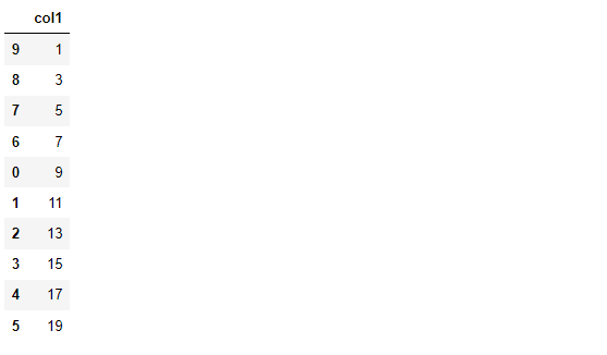 importnumpyasnpx=({"col1":(1,20,2)},index=[9,8,7,6,0,1,2,3,4,5])结果如下图: