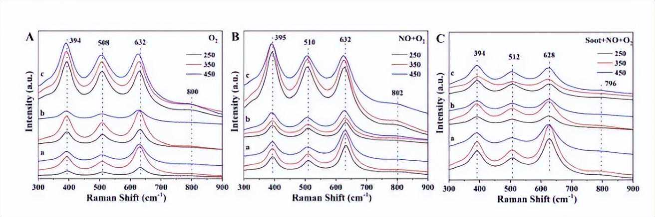 一方面,为估算吸附在催化剂表面的氧含量,对所制备的系列催化剂进行了O2-TPD测试,结果如图2b所示。所制备催化剂在O2-TPD曲线中表现出3个脱附峰,其中,450℃以下的脱附峰归属于催化剂表面物理吸附氧及弱化学吸附氧(α-O2)的脱附;450~650℃的脱附峰归属于表面晶格氧(β-O2)的脱附。