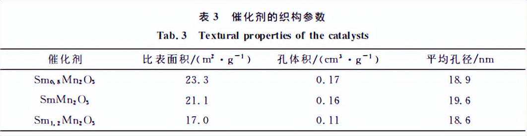 从放大的XRD谱图(图1b)可以看出,随着催化剂中Sm/Mn比值的上升,莫来石的特征峰位置向低角度偏移,这是由于Sm3+(0.108nm)的离子半径比Mnx+(Mn4+:0.065nm,Mn3+:0.053nm)大,增加Sm/Mn比值会引起莫来石晶格膨胀,因此Sm0.8Mn2O5、SmMn2O5、Sm1.2Mn2O5的晶胞体积依次增加。