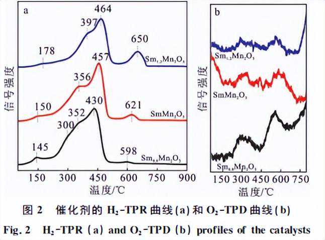其中,位于150℃的还原峰归属于催化剂表面的化学吸附氧物种;位于356℃和457℃的还原峰分别归属于莫来石中Mn4+还原为Mn3+及Mn3+进一步还原为Mn2+所消耗的氢气;位于高温段621℃的还原峰归属于样品钙钛矿杂相中Mn3+的还原。值得注意的是,当改变Sm加入量时,催化剂的H2-TPR曲线出现了一些有规律的变化。
