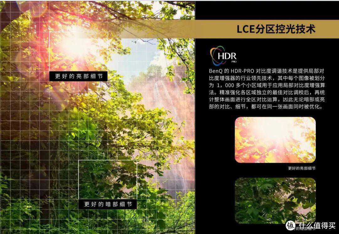 按照官方介绍,明基采用最新的智能芯片,在播放电影的时候,把画面分为1000个分区,然后对每个分区的亮度做实时演算,精准控制每个分区的gamma和亮度。最新SSIDynamicBlack™全区动态黑位增强技术,令光源明暗对比再提升20%,同时保留影像中的暗部细节。再加上LCE千区精准控光技术加持,可以将画面精细切分为1000+小分区,实时进行独立分区对比度演算优化,从而进一步实现每一帧画面从亮部到暗部都能够有一流的纯净度和细节表现。