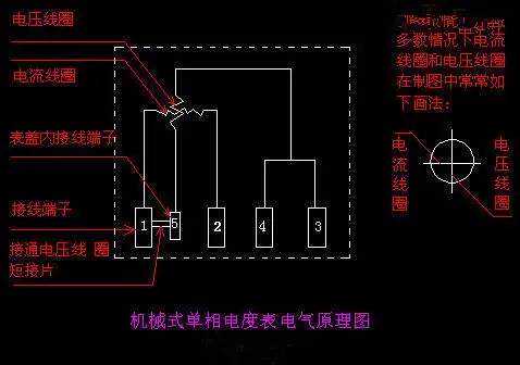 单相有功电度表(简称:单相电度表)由接线端子、电流线圈、电压线圈、计量转盘、计数器构成,只要电流线圈通过电流,同时电压线圈加有电压,转盘就受到电磁力而转动。。单相电度表共有5个接线端子,其中有两个端子在表的内部用连片短接,所以,单相电度表的外接端子只有4个,即1、2、3、4号端子。由于电度表的型号不同,各类型的表在铅封盖内都有4各端子的接线图。原理图如下