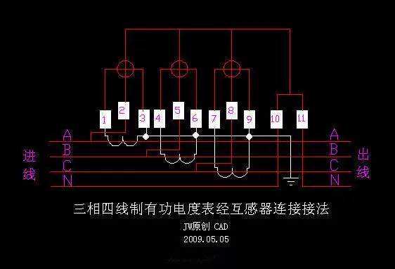 4、机械式三相四线制有功电度表的常用接法,如下图