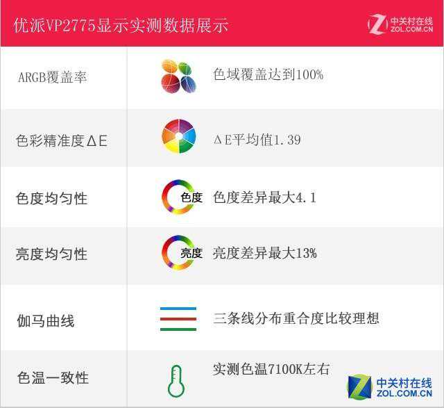 下面进行性能实测部分,测试项目有色域覆盖率、色彩还原准确度、色温一致性、色度均匀性、亮度均匀性、伽马曲线等。众多的测试项目让我们从多个方面来全方位审视优派VP2775。